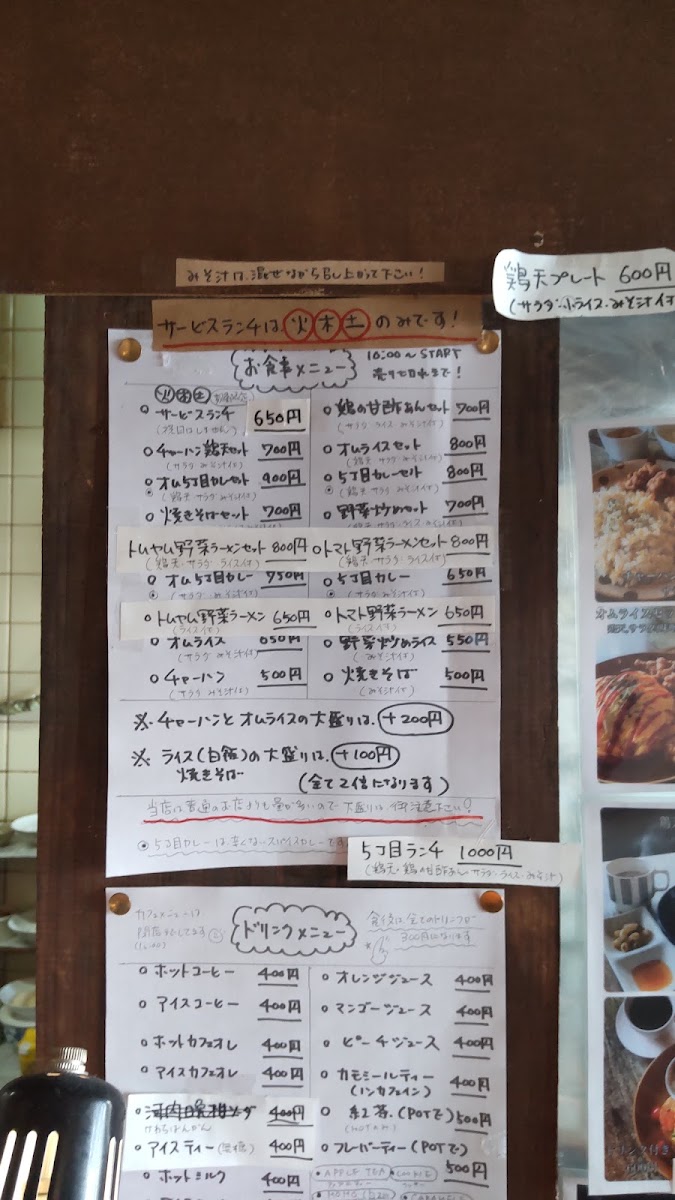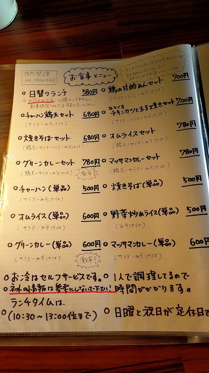 Food selections include noodle dishes such as ramen and yakisoba, alongside rice-based options like omurice, chuka-don (Chinese-style rice bowl), and various set meals combining fried rice and chicken tempura. The daily lunch specials provide variety and include curry, omelette curry, and other changing dishes designed to offer balanced and filling meals.